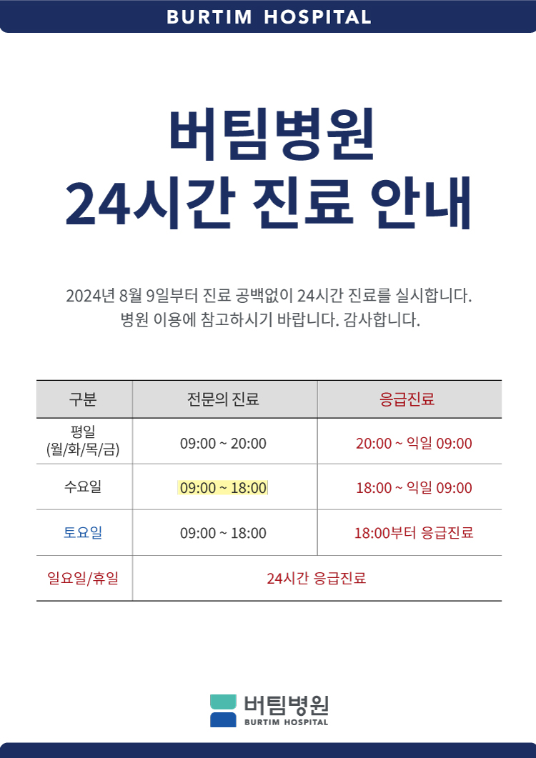 올바르게 정확하게 버팀병원, 오산점 개원 12주년 올바르게 정확하게 버팀병원, 수원점 개원 10주년 오산 & 수원 통합 내원 방문자수 161만명이 함께 했습니다. 오산점 수원점 로그인 회원가입 병원소개 인사말 의료진소개 진료시간안내 공지사항 의료장비소개 병원둘러보기 간호간병통합서비스 언론보도 버팀TV 협력기관 오시는길 관절센터 어깨 어깨충돌증후군 회전근개파열 석회화건염 오십견 관절와순파열 쇄골골절 무릎 로봇인공관절수술 줄기세포치료 퇴행성 관절염 무릎연골연화증 반월상연골판파열 십자인대파열 내측인대파열 거위발건염 점액낭염 베이커낭종 슬개건염 손·팔 상과염 팔꿈치터널증후군 손목건초염 손목터널증후군 삼각섬유연골복합체 파열 방아쇠수지증 손가락 관절염 결절종 손목골절 골반 고관절 골절 대퇴골두 무혈성 괴사 고관절 점액낭염 퇴행성 고관절염 발목·발 발목인대파열(전거비인대) 발목불안정증 아킬레스건염 발목염좌 발목골절 발목관절염 족저근막염 무지외반증 부주상골증후군 중족골골절 발가락골절 소건막류 지간신경종 거골골연골병변 내향성발톱 표재성 외상 척추센터 목 목디스크 경추관협착증 신경공협착증 거북목증후군 허리 허리디스크 척추관협착증 척추전방전위증 척추압박골절 척추분리증 소아정형센터 소아골절 휜 다리 소아 편평발 척추측만증 고관절 이형성증 소아 주관절 아탈구 일과성 고관절 활액막염 내과/검진센터 내과진료안내 건강보험공단검진 암 검진 채용건강검진 검진센터안내 재활치료센터 도수·운동치료 체외충격파치료 물리치료 고객센터 진료예약 전문의상담 치료후기 입퇴원안내 비급여안내 제증명발급 고객의소리 자주묻는질문 진료예약 전문의상담 간편상담 진료 예약 전문의상담 카카오톡상담 전화문의 1661-0032 간편상담 진료과 선택 진료과 선택 관절센터 척추센터 검진센터 기타 진료내용 선택 진료내용 선택 이름 연락처 개인정보 이용동의 상담신청 병원소개 병원소개 관절센터 척추센터 소아정형센터 내과/검진센터 재활치료센터 고객센터 공지사항 인사말 의료진소개 진료시간안내 공지사항 의료장비소개 병원둘러보기 간호간병통합서비스 언론보도 버팀TV 협력기관 오시는길 공지사항 [버팀병원 오산점] 24시간 진료체제 시행 작성자버팀병원 등록일2024.08.09 목록