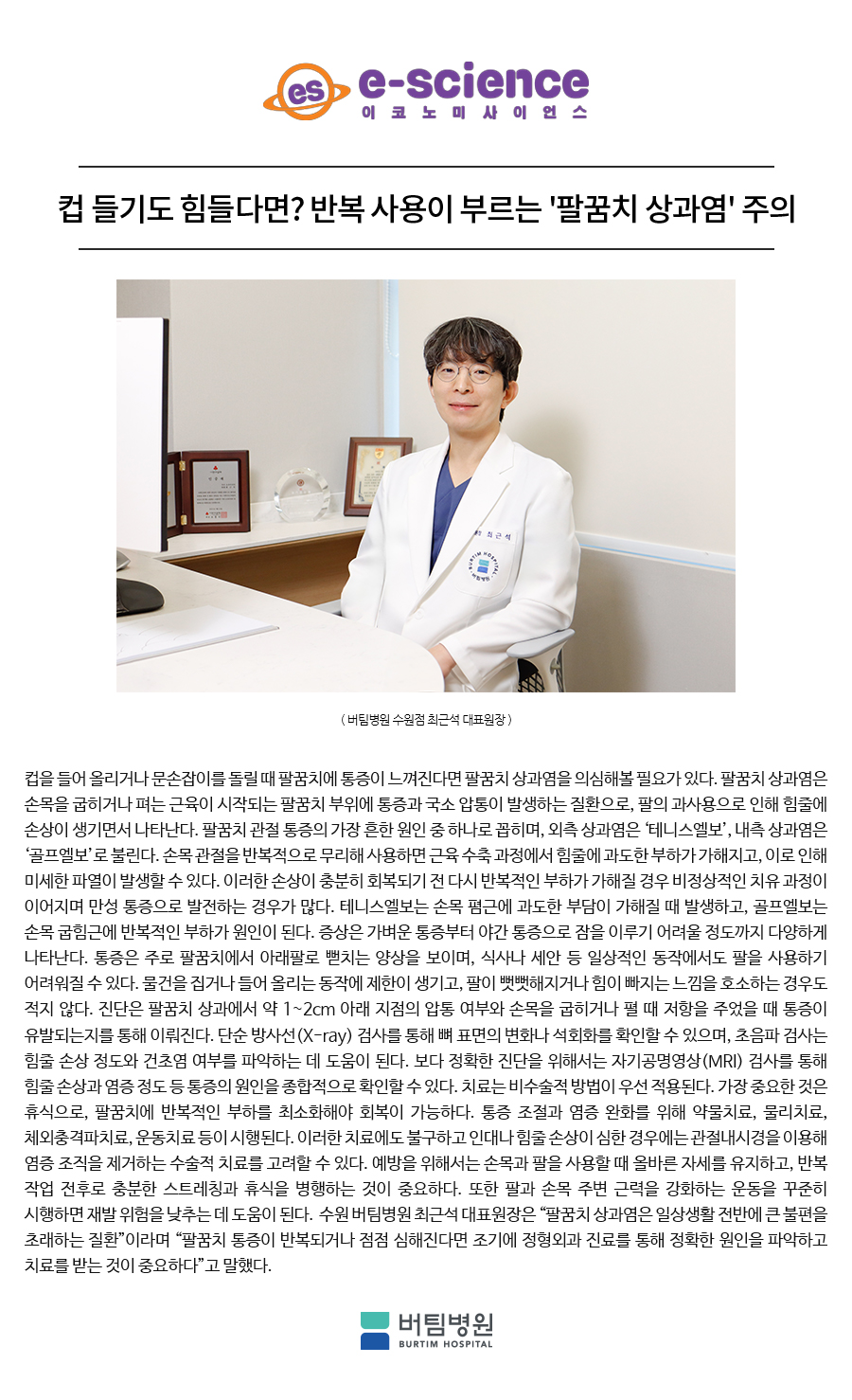 [수원] [버팀병원 수원점 언론보도] 컵 들기도 힘들다면? 반복 사용이 부르는 '팔꿈치 상과염' 주의