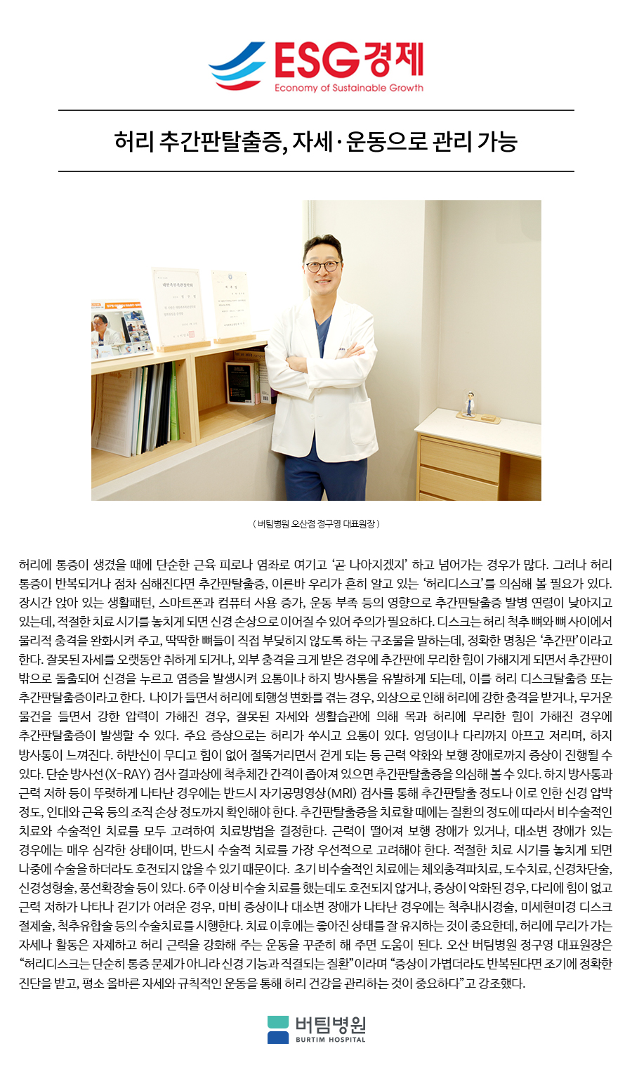 [버팀병원 오산점 언론보도] 허리 추간판탈출증, 자세·운동으로 관리 가능