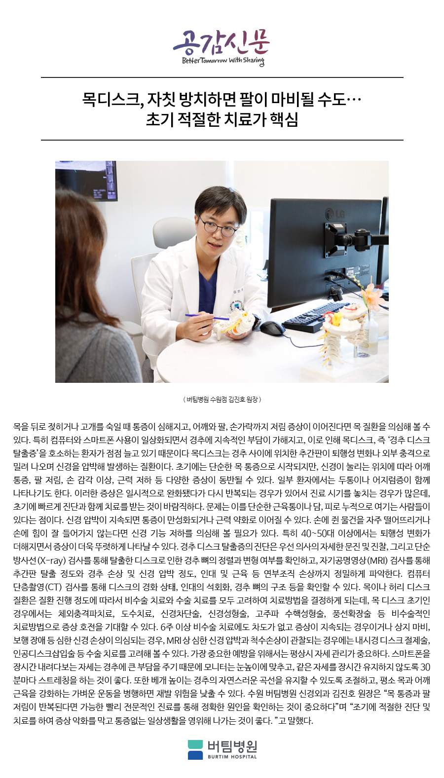 [버팀병원 수원점 언론보도] 목디스크, 자칫 방치하면 팔이 마비될 수도… 초기 적절한 치료가 핵심
